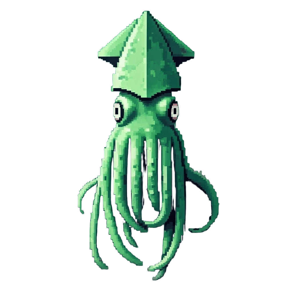 A striking picture of a colossal squid in bright green and yellow. The artwork employs clean lines and geometric shapes in a retro 8-bit aesthetic reminiscent of classic video games.