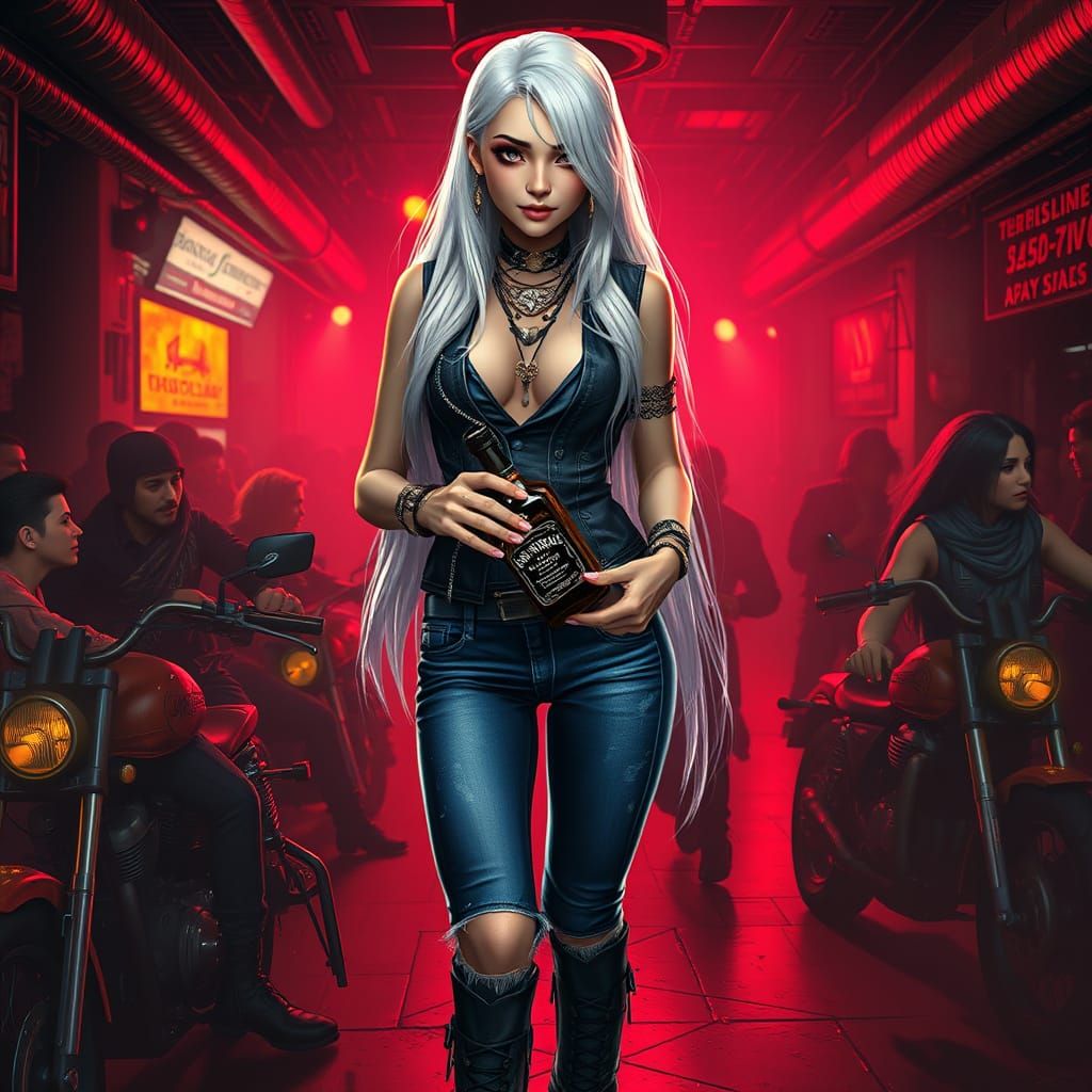This image depicts a striking Thai woman with long white hair, dressed in a leather vest and blue jeans, surrounded by the dark fantasy world of a gothic bar, filled with bikers and vibrant lighting, as she holds a bottle of Jack Daniels amidst a dynamic and energetic atmosphere.