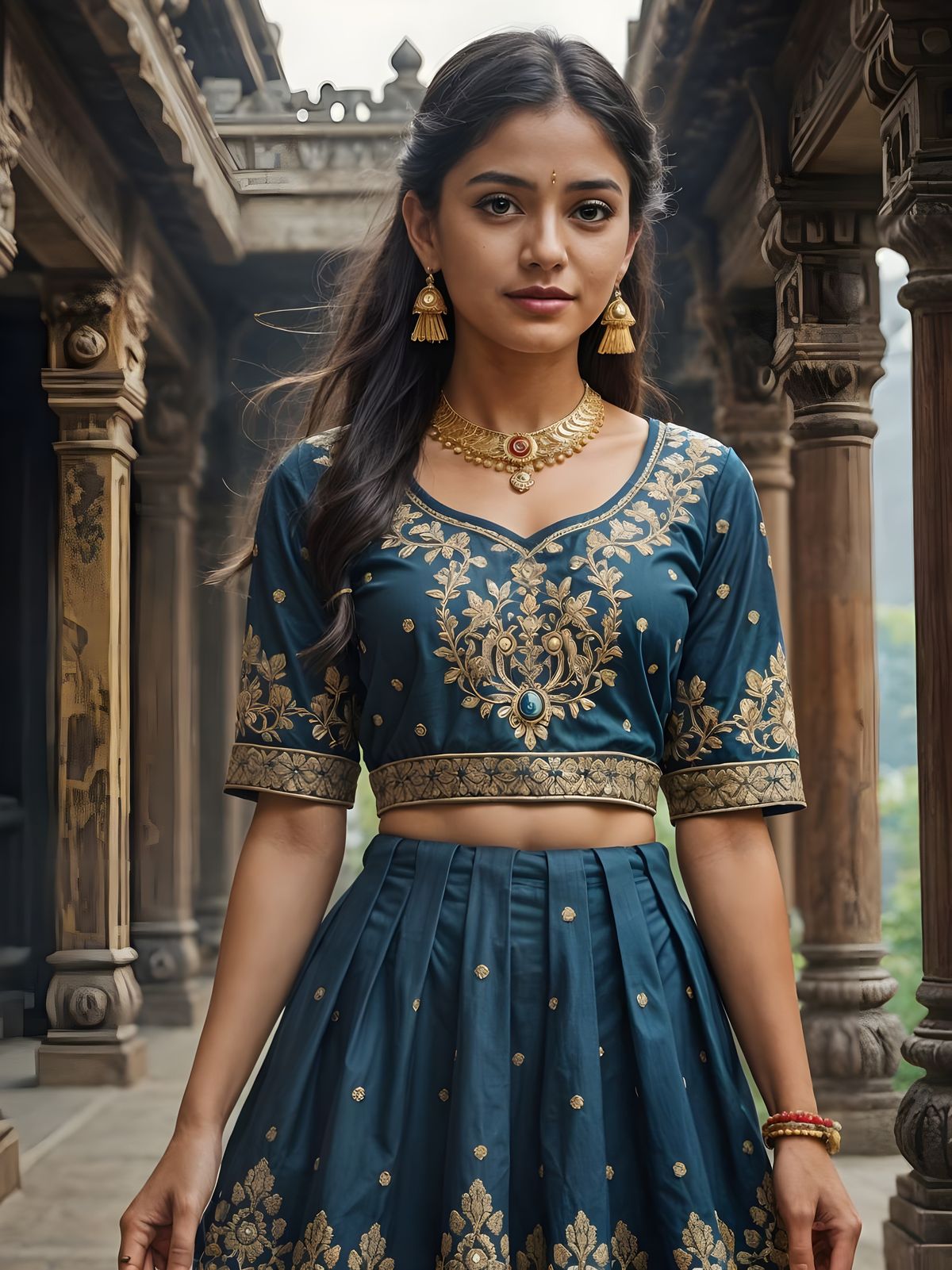 This image showcases a young South Asian woman confidently posing in traditional Indian attire. The photograph features a teal crop top and matching skirt with gold embroidery, complemented by traditional jewelry, set against an ornate, warm-toned backdrop.