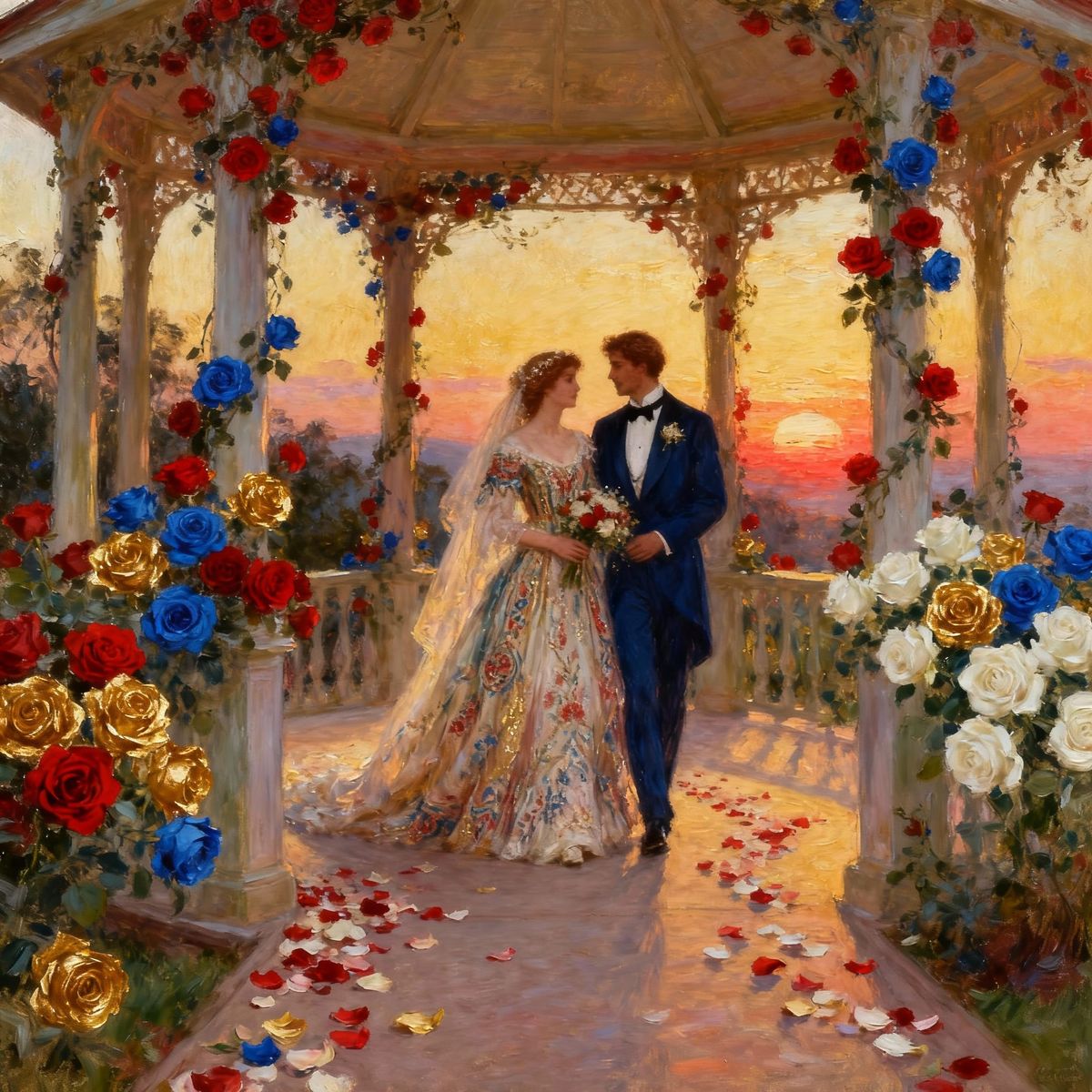This image shows a bride and groom in a romantic, dreamlike oil painting style. They stand in a gazebo decorated with roses, with a sunset backdrop and rose petals on the aisle.