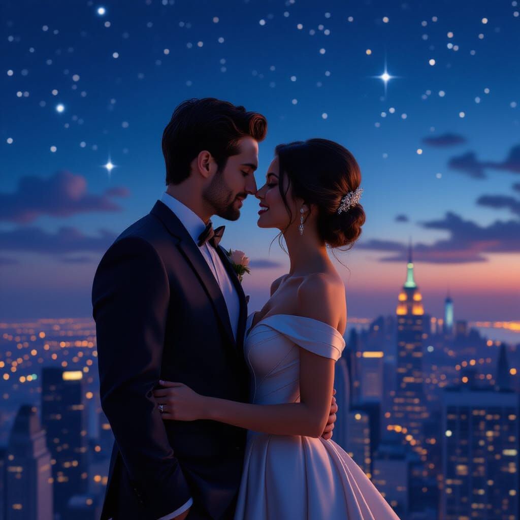 This image shows a couple about to kiss against a vibrant cityscape at dusk under a starry sky. The scene is rendered in a hyperrealistic, cinematic style with surreal atmospheric effects.