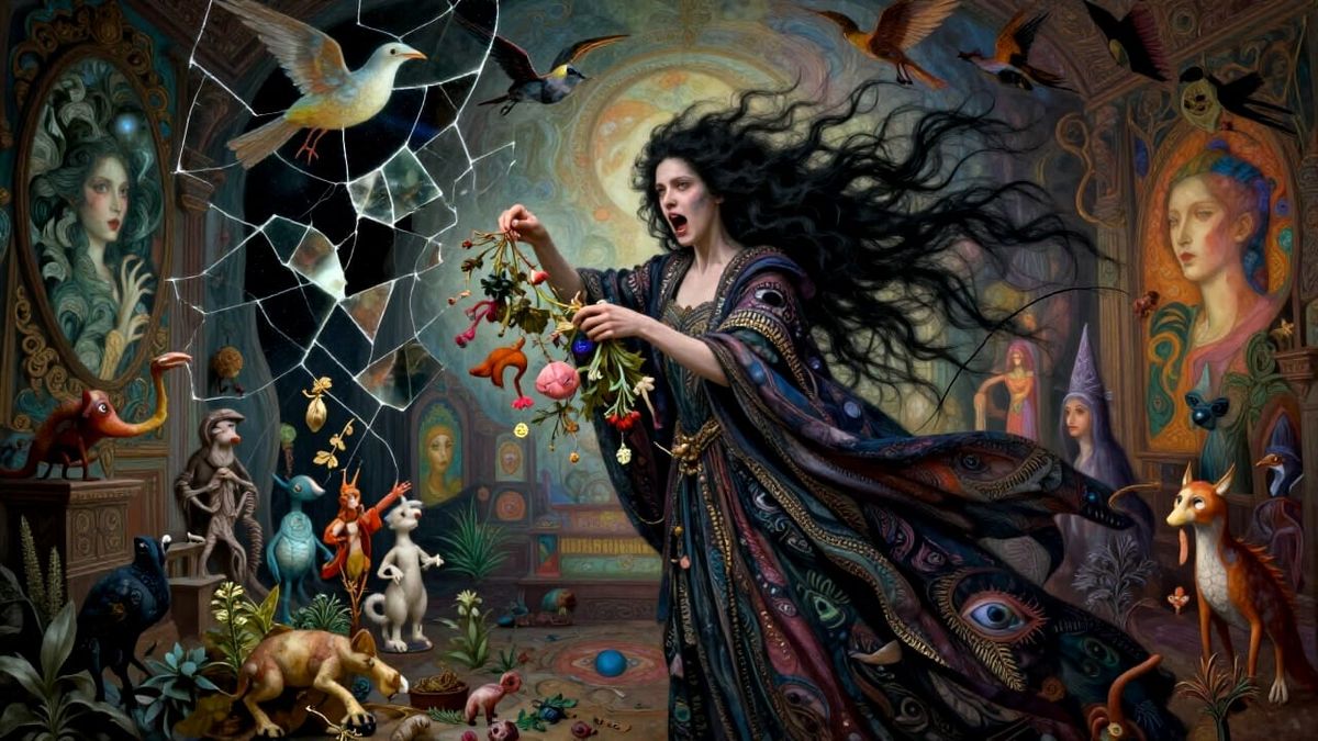A witch with long hair gathers ingredients in a vast, surreal room shaped like a spacecraft. The detailed, realistic photo features intricate textures and symbolic language, creating an ethereal atmosphere.