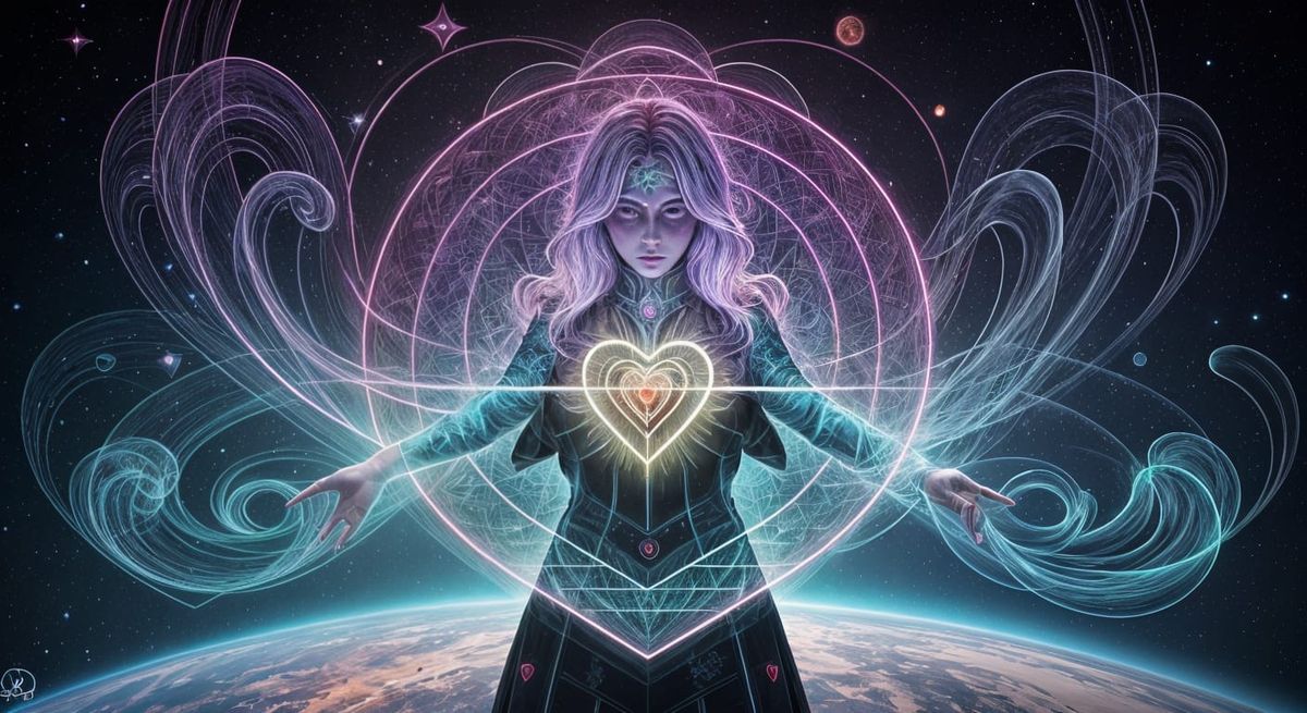 This holographic astral illustration depicts heart chakra activation with vibrant cosmic colors and intricate detail, rendered in a mixed-media style reminiscent of visionary art.