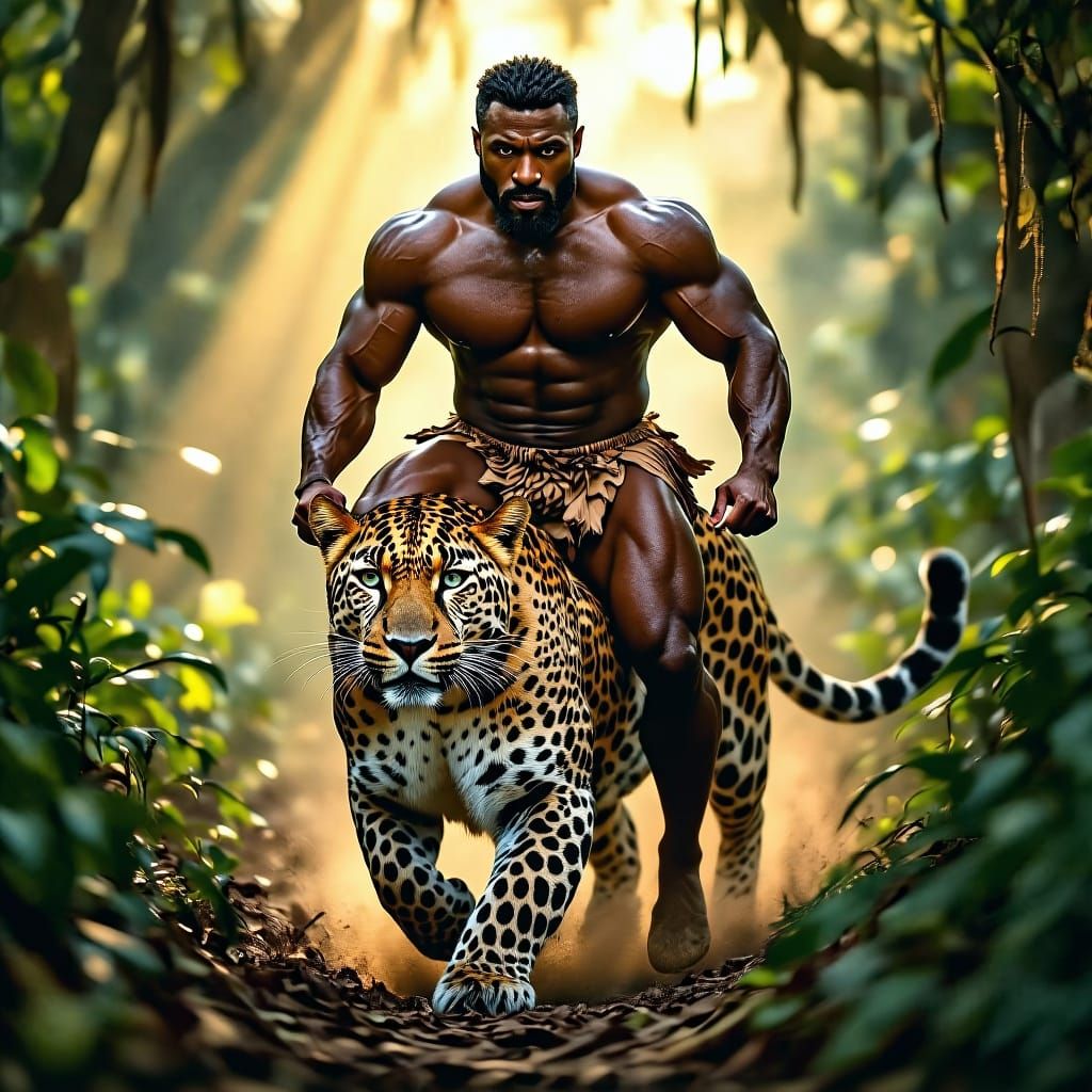 A man sits atop a dramatically oversized leopard in a jungle. Captured in high-resolution DSLR photography style with sharp details and rich textures.