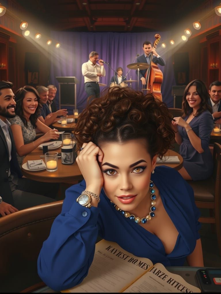 This image shows a beautiful woman with curly hair in a navy blouse, set against a dimly lit jazz club scene. Features cinematic lighting and a medium format film aesthetic.