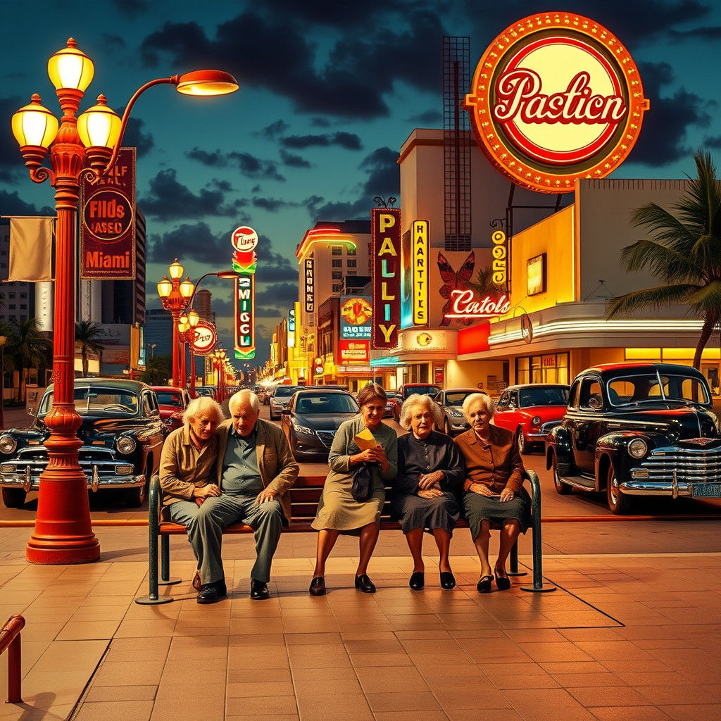 This image shows elderly people on a Miami bench in the 1940s. Retro streetlights, vintage cars, and art deco buildings create a nostalgic community scene with golden lighting.