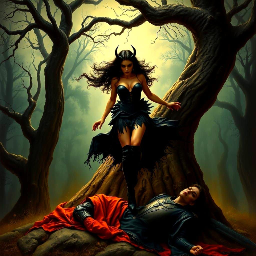 A dark and mystical image of Lilith, a beautiful goddess in black leather, gazing upon a sleeping knight with evil intent, set against the backdrop of an enchanted forest.