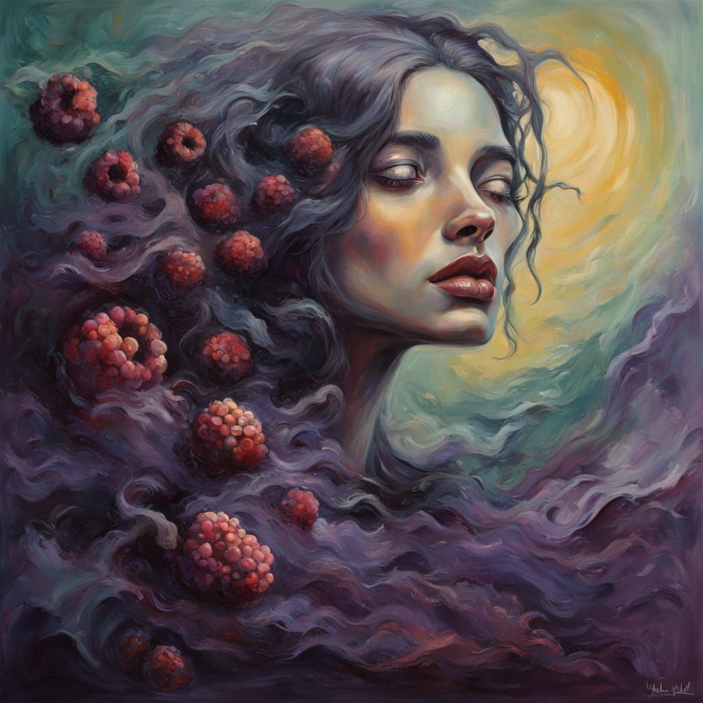 This oil on canvas artwork depicts a surreal close-up of a woman whose beauty appears to soften the earth. She offers symbolic tokens: a look, a word, and a wild raspberry, in golden hour light.