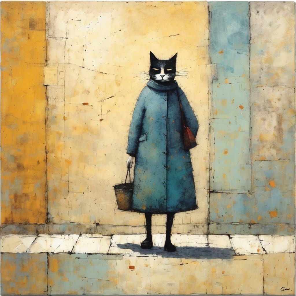 This image depicts a whimsical cat lady in the style of naive art. The artwork features a charming character surrounded by cats, rendered in a painterly and cheerful aesthetic.
