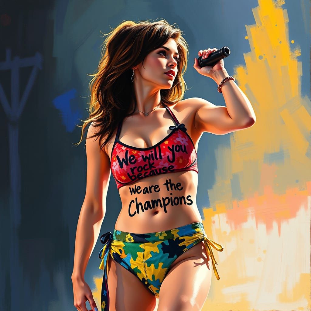 A young woman in a bikini confidently poses on a stage. The image is rendered in a neo-impressionistic style, with expressive brushstrokes and a blend of smooth acrylics and textured oils.