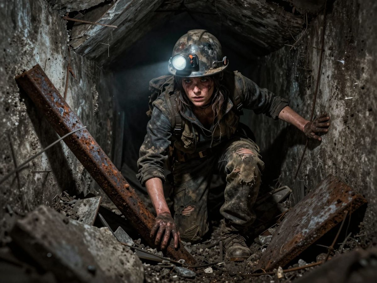 A highly detailed matte painting of a soot-stained explorer navigating a narrow, debris-filled post-apocalyptic tunnel with dim, realistic lighting. Concept art evoking horror and wasteland themes.