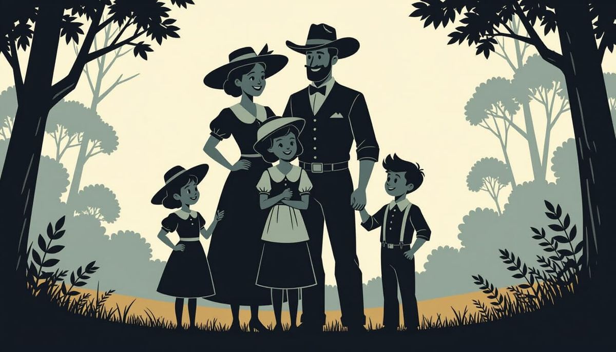 An Australian pioneering family (cartoon silhouette style).
