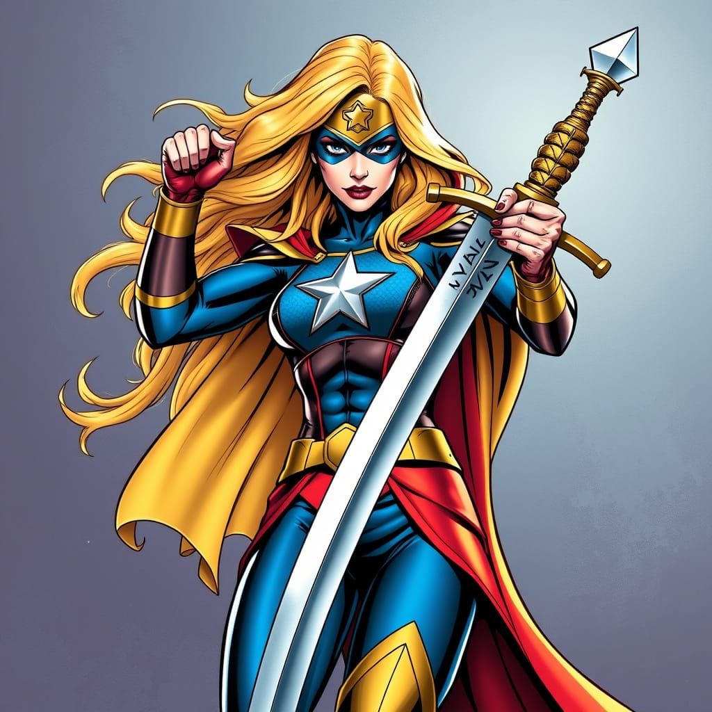 This striking image combines classic superhero style with fantasy epicness, featuring Stargirl from DC Comics holding the legendary Excalibur sword with both hands, amidst bold lines and vibrant colors.