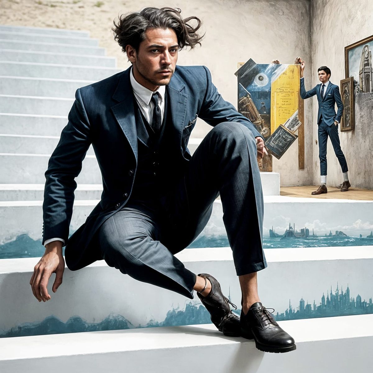 A striking oil painting of a man. The artwork employs a maximalist aesthetic with conical perspective, rendered in unreal engine with a blurry, dieselpunk style and a palette of yellow and blue.