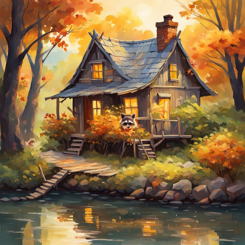 This image shows a raccoon's whimsical home built from tree branches on a riverbank. The painting features warm light, colorful leaves and soft brushstrokes in an impressionistic style.