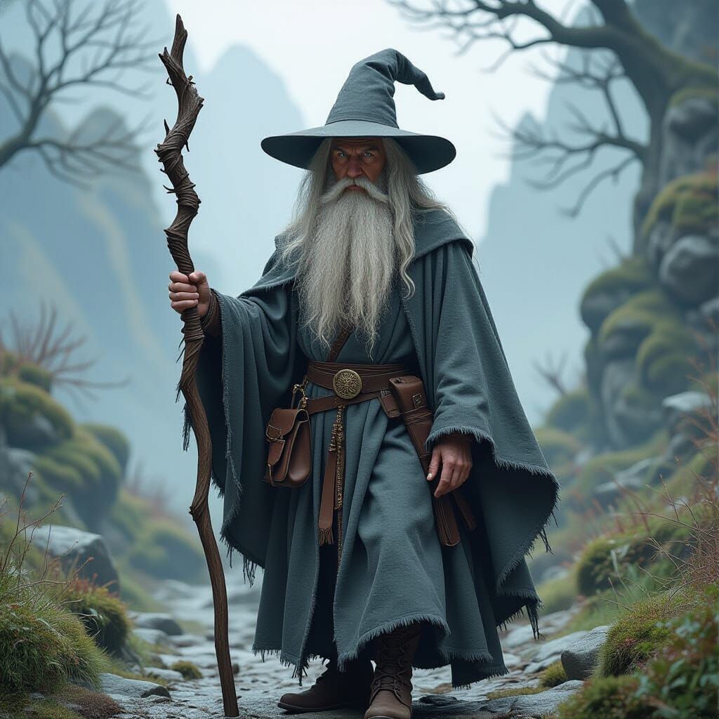 This image shows an elderly wizard with a long grey beard and piercing eyes. He wears a grey robe and hat, holds a staff, and exudes a mystical aura, in a serene fantasy setting as digital artwork.