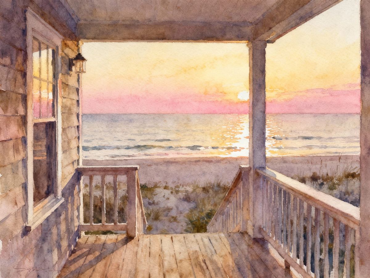 This image captures a serene sunset view from a beach house porch, rendered in a vibrant watercolor style with expressive brushstrokes.