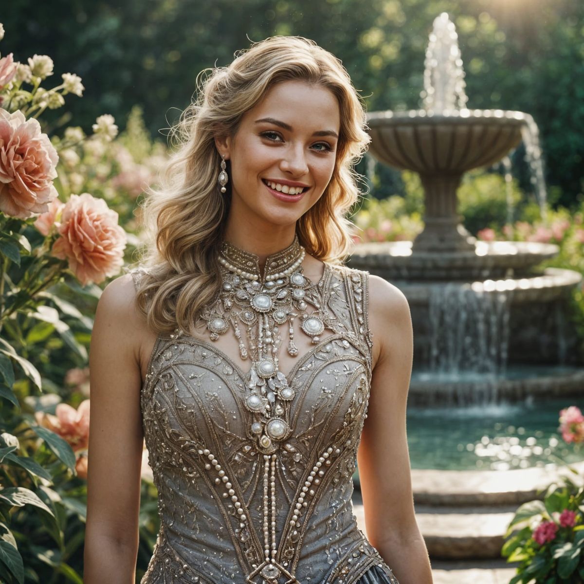 This image is a stunning, hyper-realistic portrait of a young, dark blonde woman with a subtle smile, set against a beautiful, atmospheric backdrop of a garden with a water fountain and flowers. She wears a futuristic dress adorned with diamonds, pearls, and rubies, evoking a sense of cinematic luxury an...