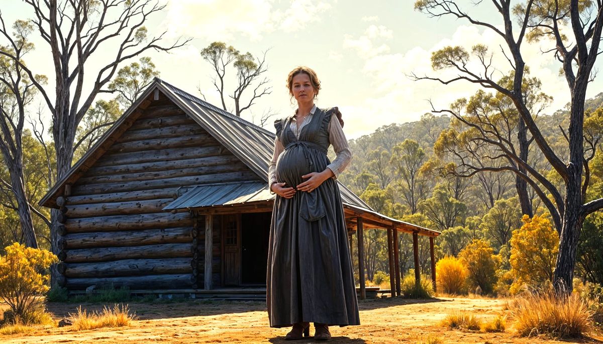 This image shows a pregnant pioneer woman standing before a log cabin in the Australian outback. She wears a long dress, with tall eucalyptus trees and bushland behind.