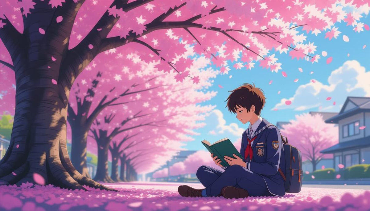 This image shows a student reading a book beneath a blossoming cherry tree. Soft pink petals create a dreamy atmosphere in this 3D rendered digital art with an anime aesthetic.