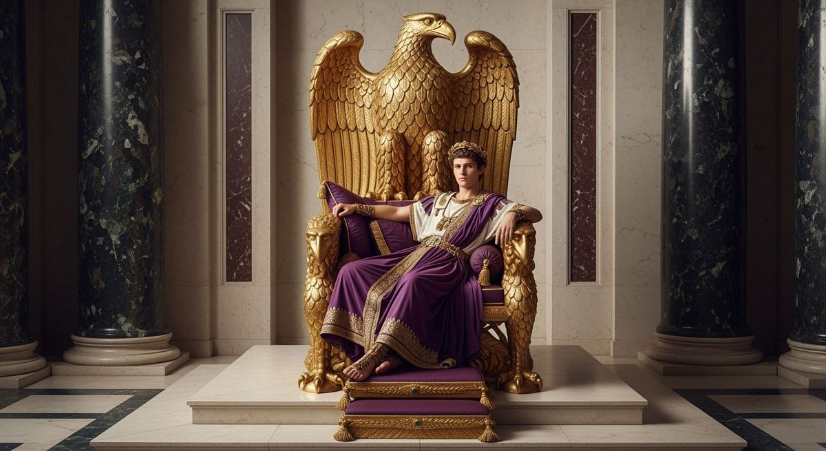 This image shows Emperor Nero relaxing on an ornate throne in his palace. He wears a gold and purple toga with a wreath crown. The image is presented as a professional photograph with sharp focus and perfect lighting.