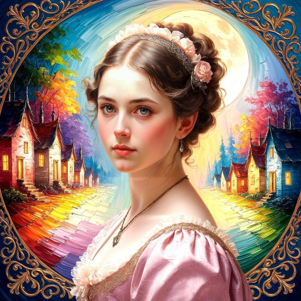 A captivating close-up of a beautiful young woman in Victorian attire. The neo-impressionist oil painting uses textured paint and filigree patterns. A moonlit village provides a dreamlike backdrop.