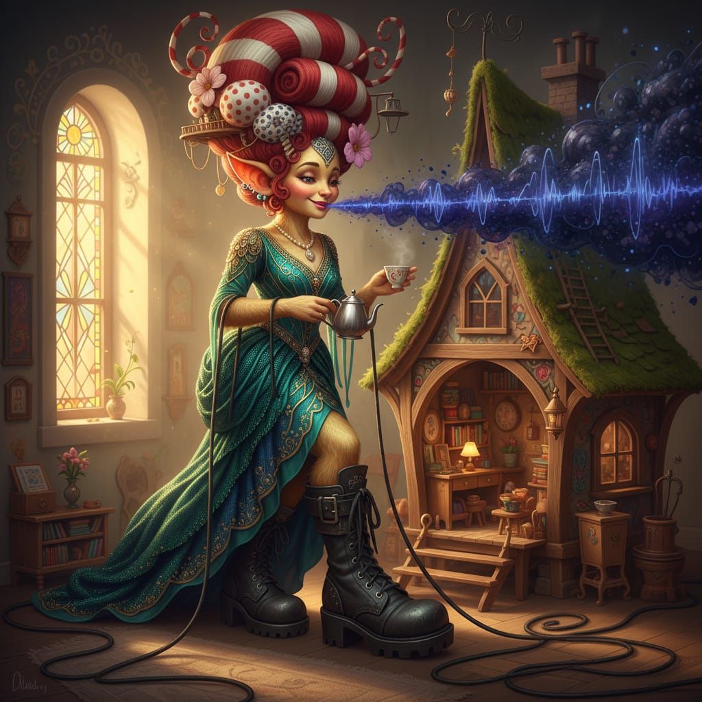 she was dressed by Scott Fitzgerald with hair by Dr Seuss her boots by Gomez Addams their laces long and loose her voice came from Tom Waits it was rough but pure and deep as round the place she pottered her tiny house to keep so dear friends you might well ask which parts of hers were her why the shell-like ...