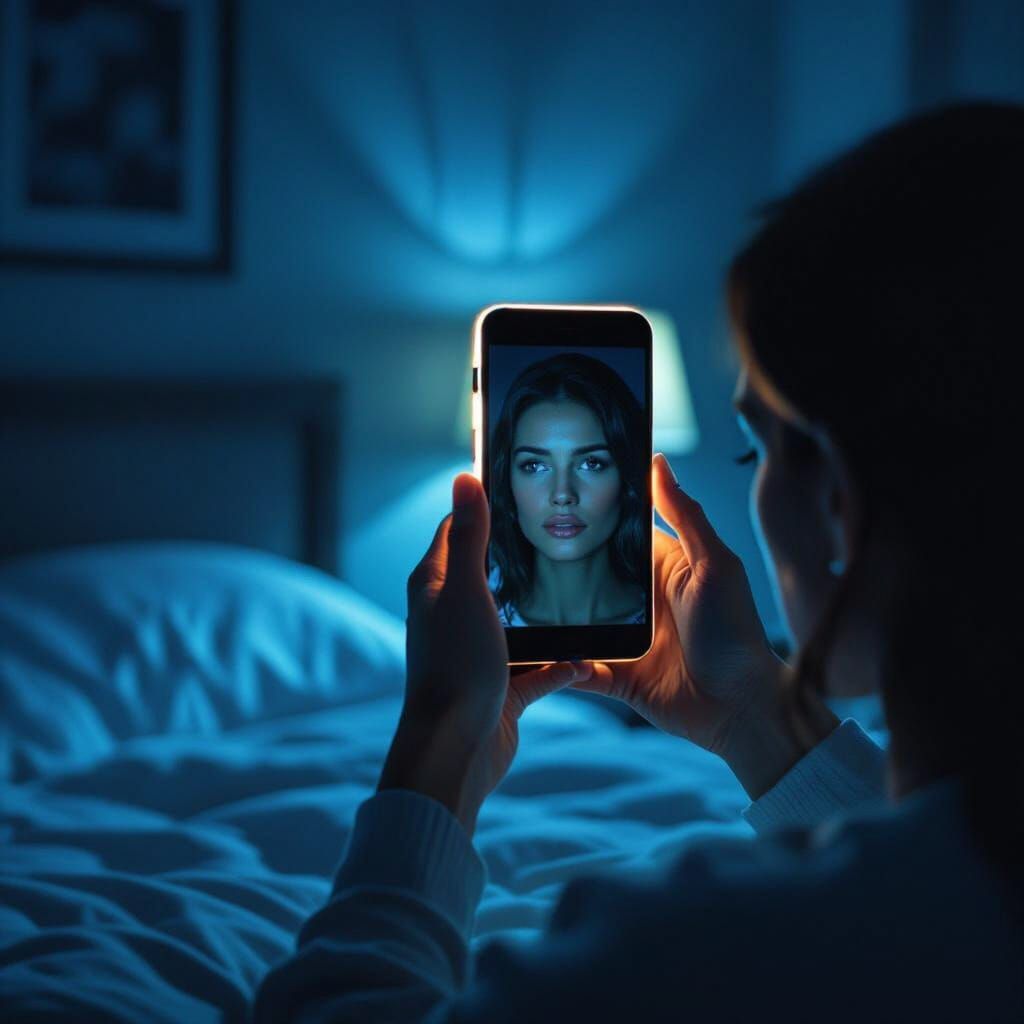 A cinematic film still shows a hand holding a glowing phone to an ear in a dark bedroom. A faint face reflection appears on the screen, with dramatic lighting and film grain.