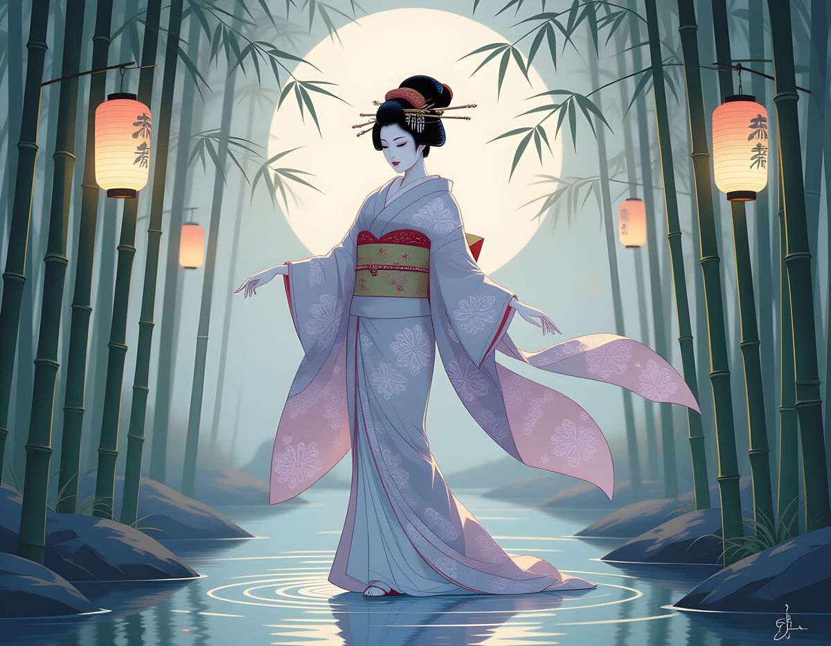 A captivating image of a spectral geisha dancing in a bamboo forest. Her moonlit kimono flows around her as she moves beneath luminescent lanterns in a haunting, mystical ambiance. The artwork evokes dreamy symbolism.
