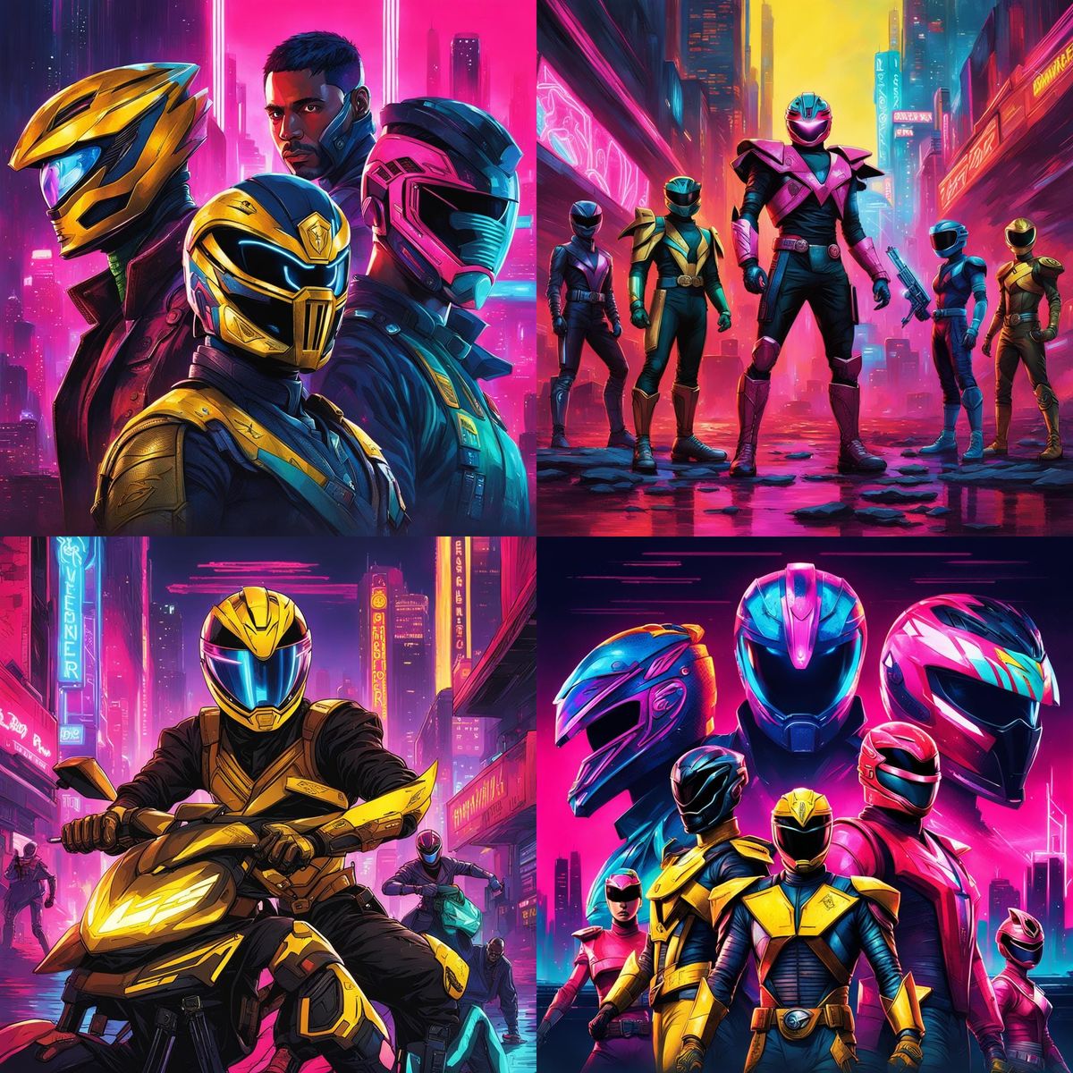 This image shows power rangers in a futuristic cyberpunk city. Neon lights illuminate the scene in a Blade Runner 2049-inspired aesthetic.