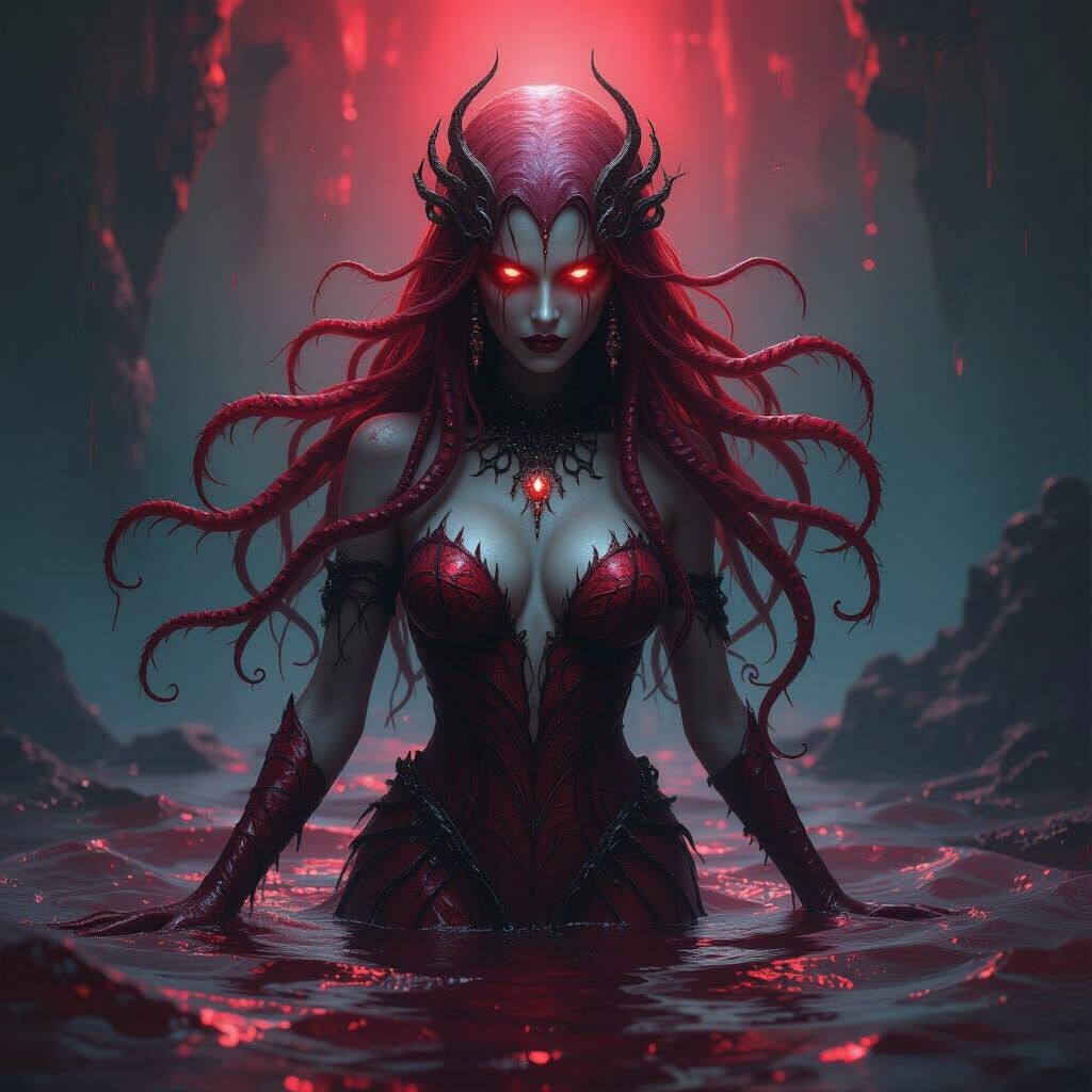 This image depicts an eldritch siren witch, a creature blending vampire squid and mermaid features, with glowing eyes and bioluminescent tendrils in a Lovecraftian ocean. Rendered in a cosmic horror style with dark, saturated colors and oppressive lighting.