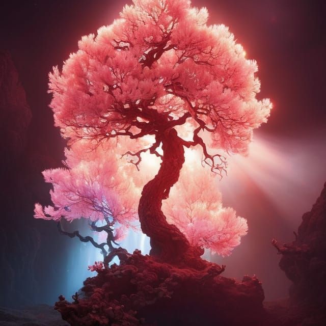 A stunning image of a magical tree standing in a river of lava. The artwork features dramatic lighting, intricate details, and a psychedelic color palette, reminiscent of classical painting.