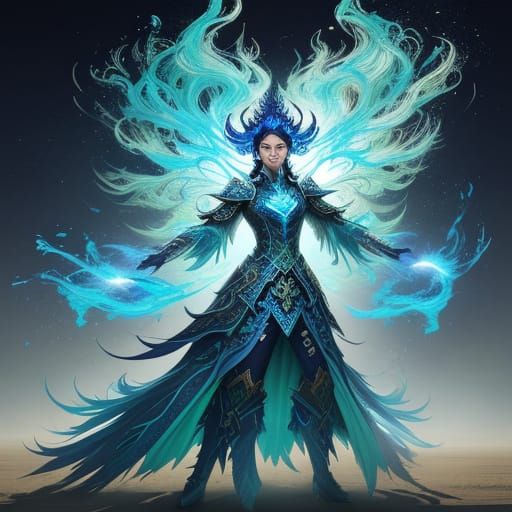 This hyperrealistic concept art captures a young Asian woman at Burning Man, adorned in blue, green, and silver. Experience vibrant colors and dramatic lighting in this detailed splash art.