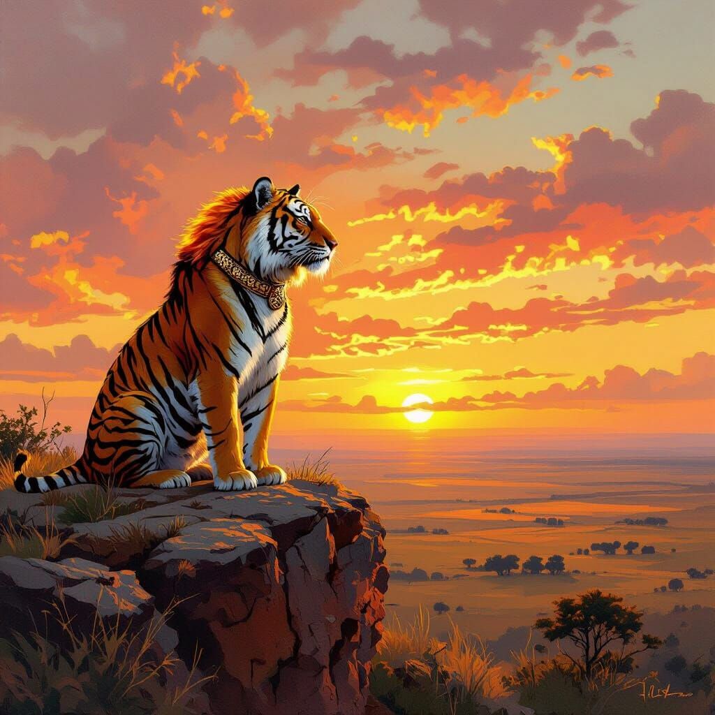 A striking picture of a tiger with a fiery mane standing on a cliff. The sunset casts long shadows across the savannah in vibrant oranges and reds, reminiscent of romantic landscape paintings.