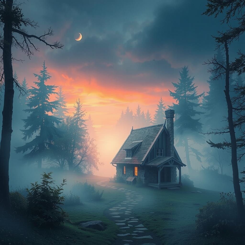 This serene image captures a small medieval cottage nestled in a foggy forest at sunrise, evoking a sense of mystique and tranquility in a digital painting style
