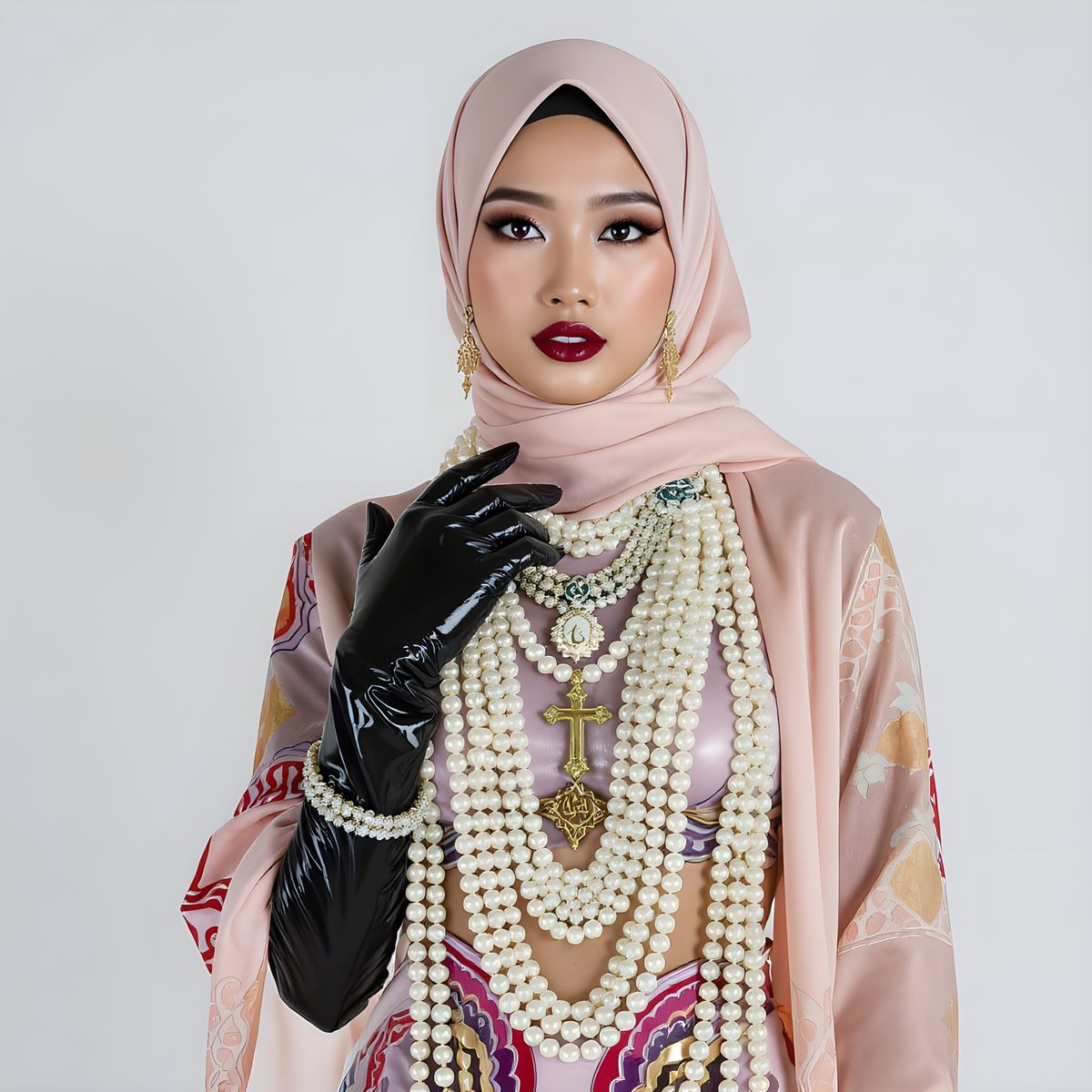 This image shows a person wearing a hijab and latex clothing, adorned with a pearl body chain and jewelry. The aesthetic blends cultural and modern elements.