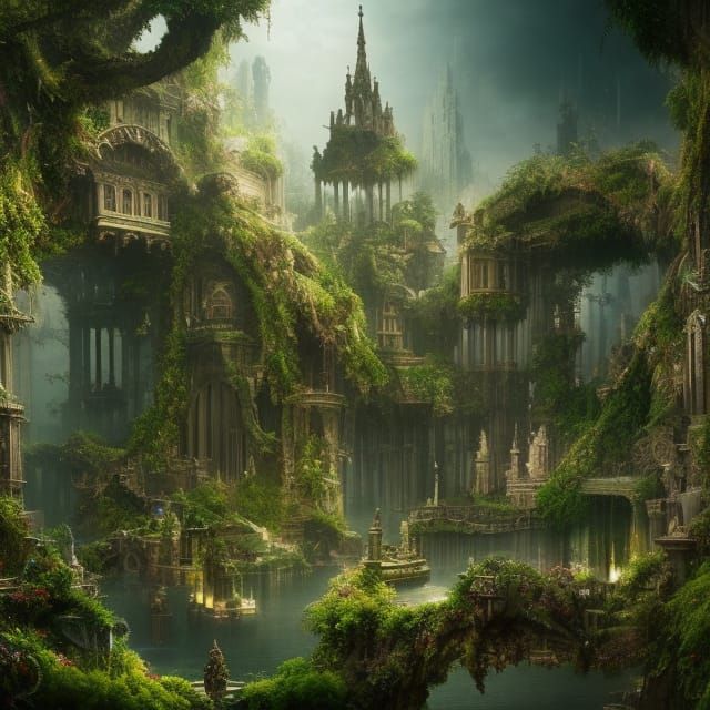 A vibrant image showcases the City of Eden, featuring floating gardens, serene waterways, and flowering trees. Divine architecture and light create a utopian, detailed digital matte painting.