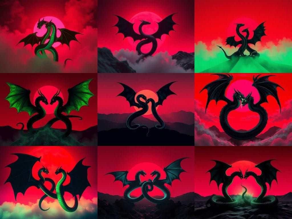 Two black plated evil sleek winged serpents intertwined in the red night sky Lost design coherent lifelike illustration award winning cotton clear vapor atmospheric lighting Liminal minimalist synthwave vapor morning Journey album cover Midnight Consortium. vibes with slow burn full length fluorescent ...