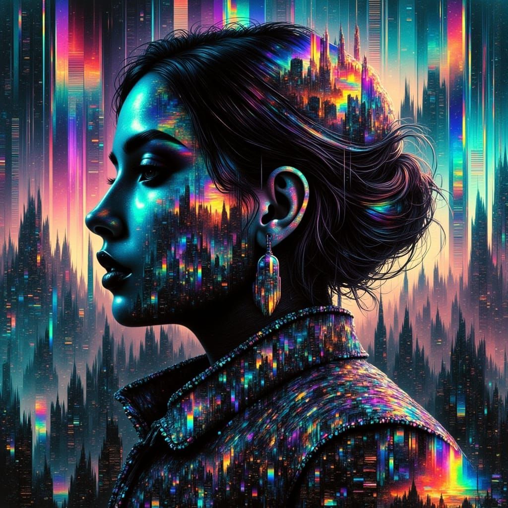 A striking picture of a female soldier in a sci-fi setting. The image has a glitch art aesthetic, with rainbow skies and matrix code effects, rendered with dynamic lighting.