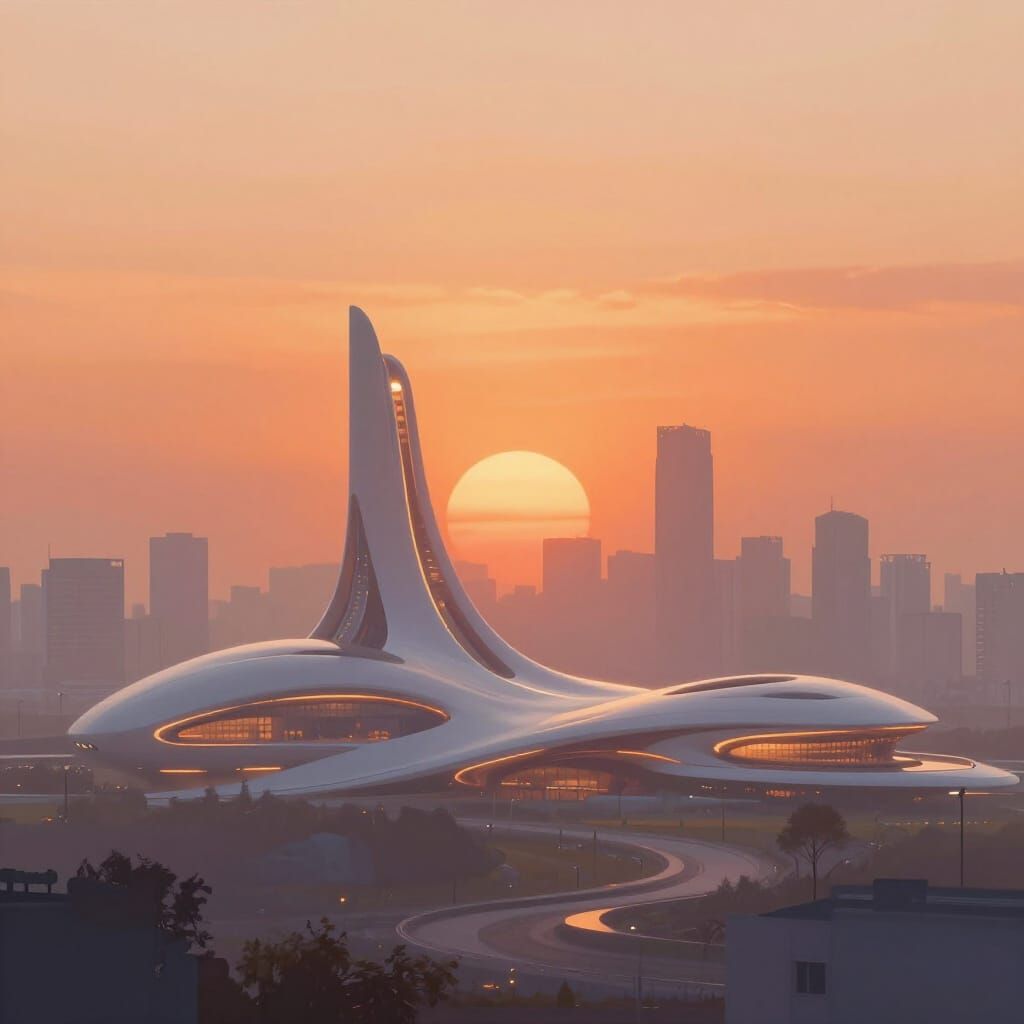 This image depicts a peaceful, futuristic cityscape at sunset. Smooth, flowing architecture glows with bioluminescent lights, rendered in a soft, dreamlike digital painting style with warm pastel gradients.