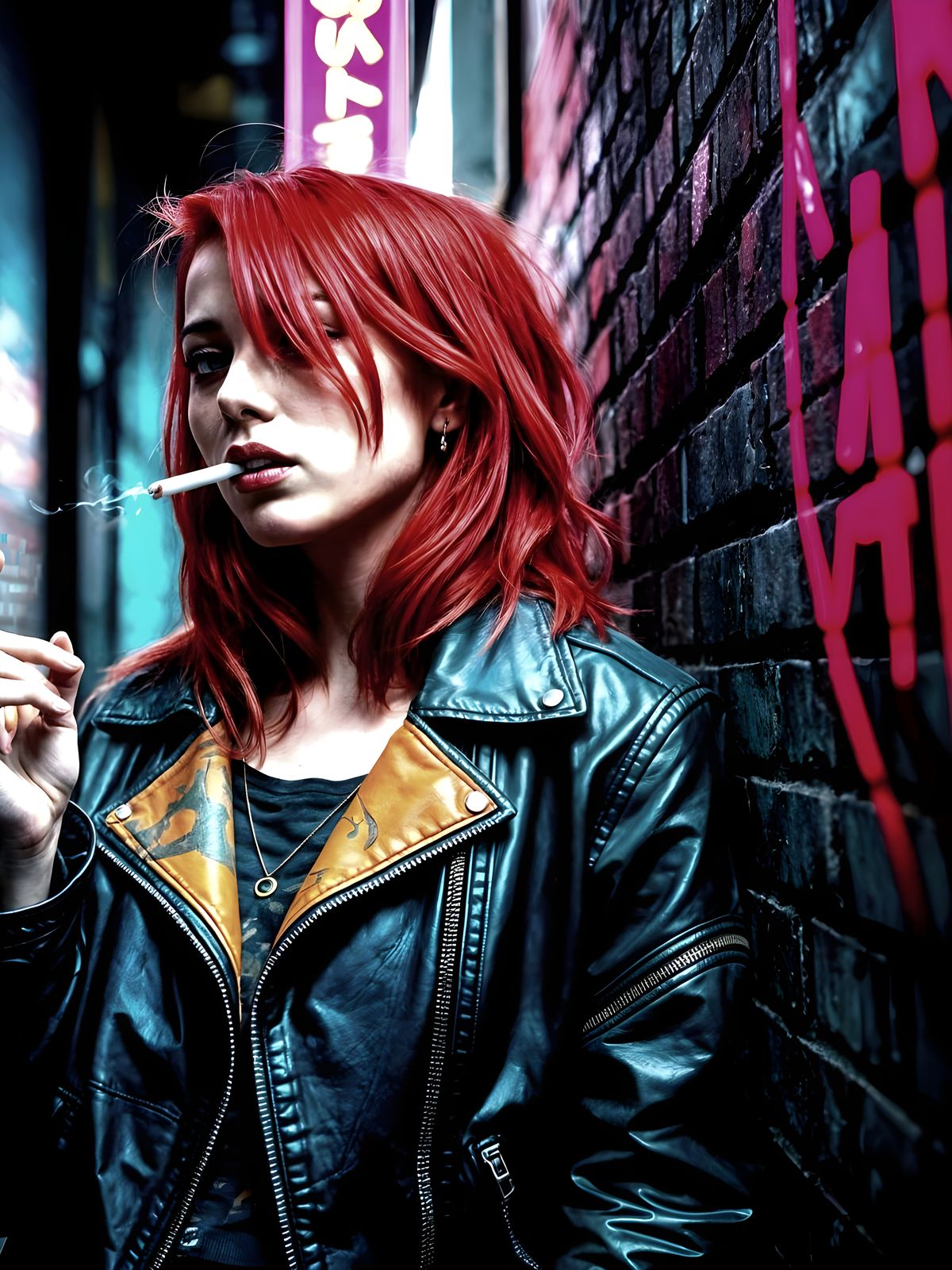 This image shows a red-haired woman in a neon-lit urban alley, smoking while leaning against a brick wall. She wears a leather jacket in a hyperrealistic, maximalist style.