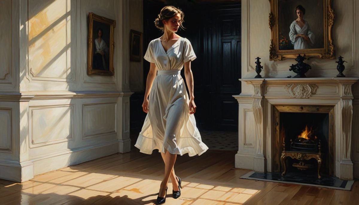 A vibrant image of a woman in a white dress and black heels, rendered with expressive brushwork. The scene is lit dramatically, showcasing hyperrealistic details and dynamic movement in a classical realism style.