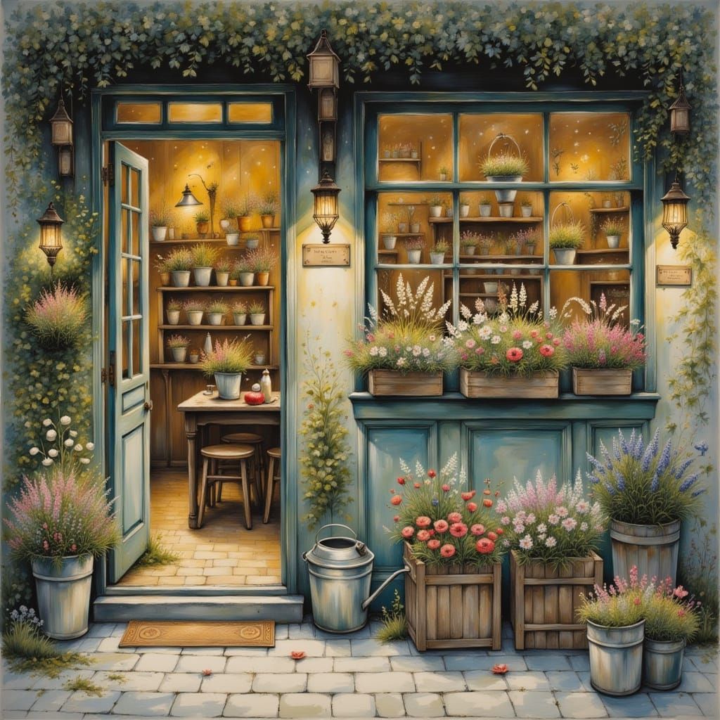 A serene painting of a quaint flower shop at dusk, with blooming flowers, a watering can, and wooden planters, evoking a sense of peaceful tranquility