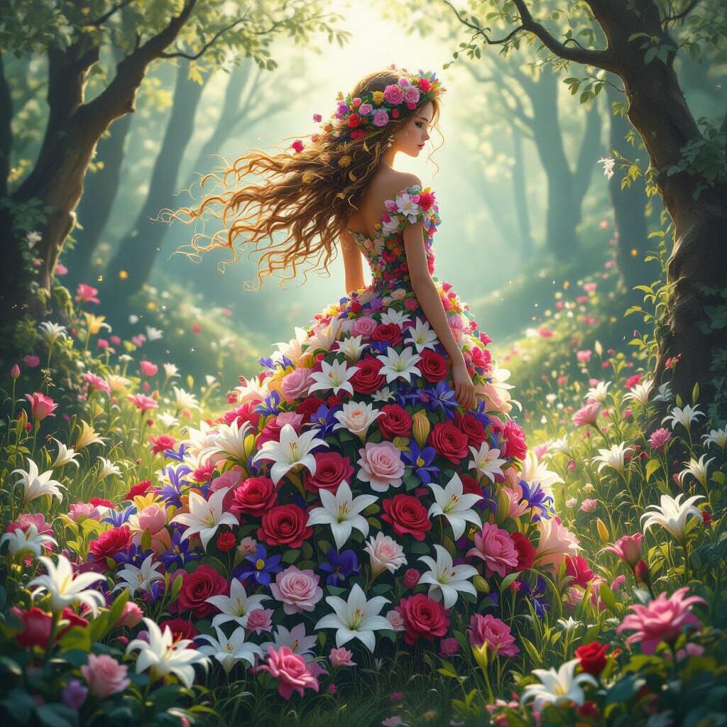 A hyperrealistic painting depicts a girl crafted from blooming flowers, standing in a mystical forest clearing with ethereal light, showcasing intricate details and luminous colors.