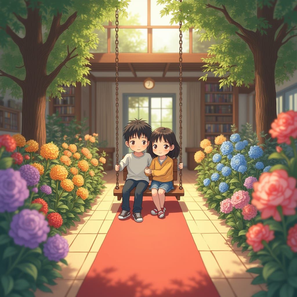 This image shows a couple in a cozy, plant-filled home. The scene is rendered in a slice-of-life anime style with warm tones and breathtaking detail.