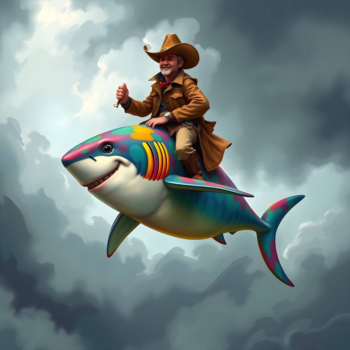 A whimsical image of a shark soaring through a turbulent sky, with a cowboy perched on her back, blending elements of modern animation and surrealist art.
