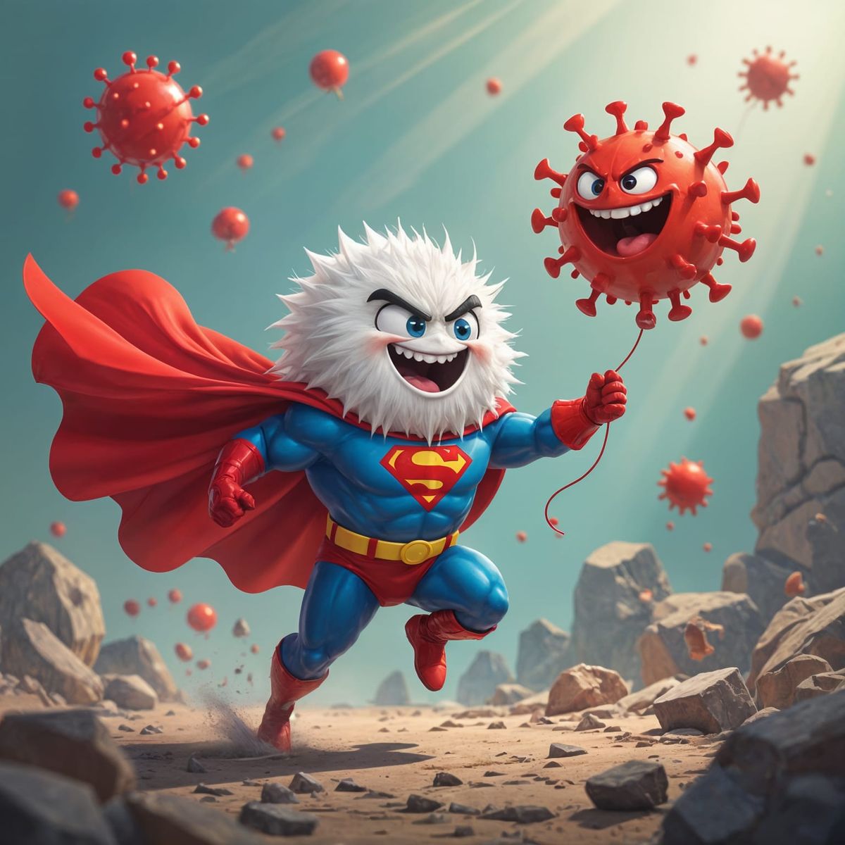 This image shows a heroic white blood cell in a superhero costume chasing a laughing, spiky balloon virus. Rendered in a hyperrealistic splash art style with dramatic lighting and a colorful background.