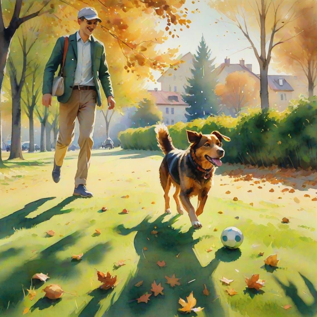 This image captures a joyful moment of a person and their dog playing with a ball on a serene green lawn, surrounded by vibrant brown leaves and warm sunlight.