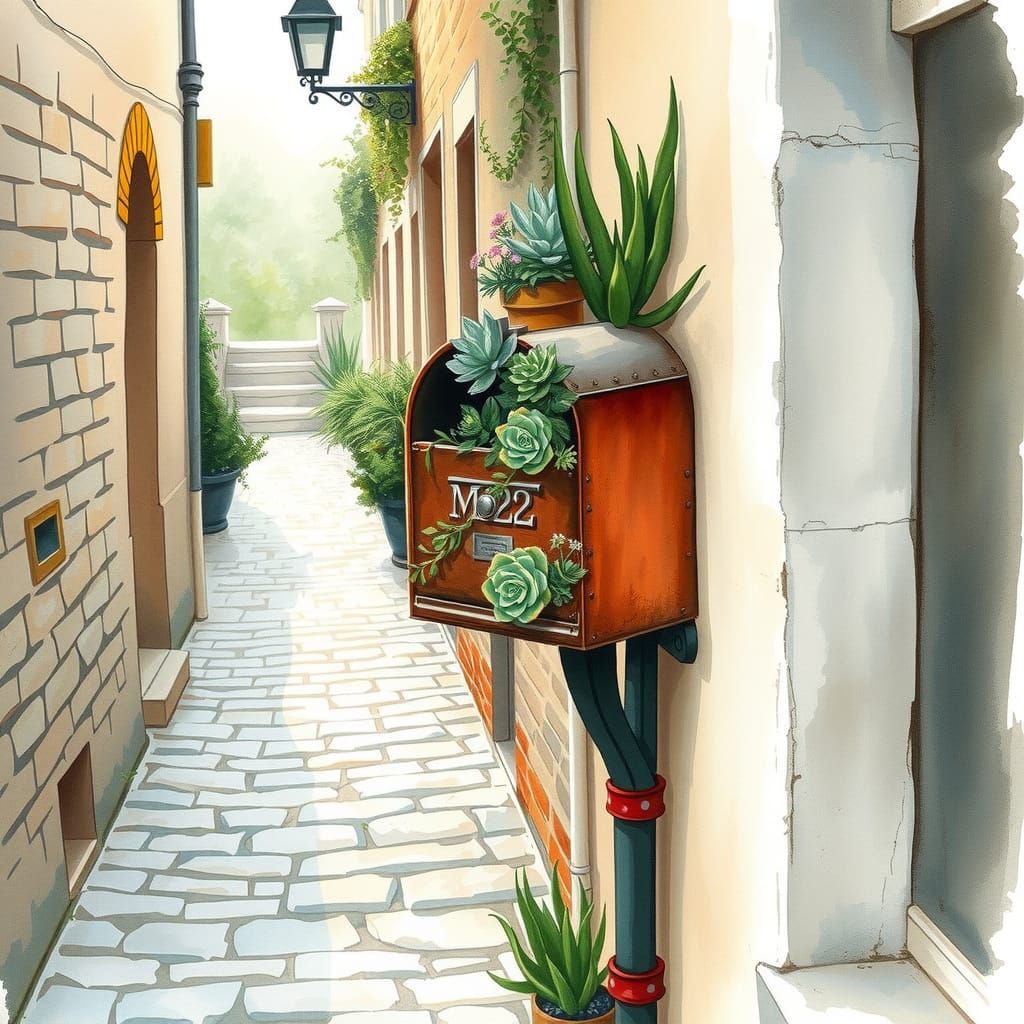 watercolor art prompt: Medium shot of a rusted, open mailbox in a quiet, cobblestone alleyway, overflowing with lush succulents and tiny blossoms. Painted in soft, pastel watercolor with delicate brushstrokes and muted tones. Warm afternoon sunlight filters in, casting gentle shadows. The scene feels ...