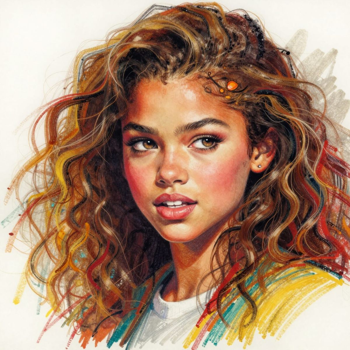 A highly detailed, sharp-focus image of Tricia Helfer portraying Zendaya. Features vibrant red, amber, yellow, and teal colors with a trembling, intricate effect, rendered in a crayon and marker style.
